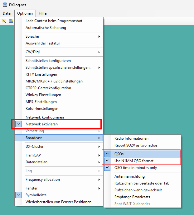 Bitte speichern und dann zum Punkt Option -> Broadcast und im Untermenü “QSO” und “Use N1MM QSO format” aktivieren.