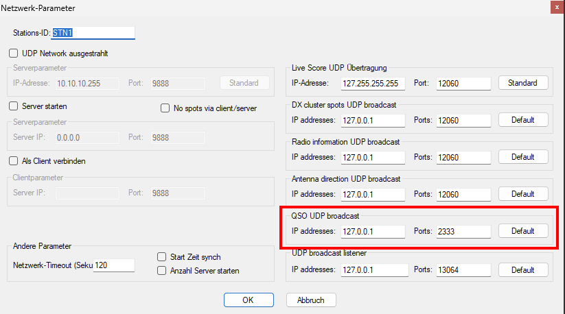 Bei DXLog gibt es wichtige Punkte unter Options -> Network Configuration -> Markierung bei UDP Networking for multiple stations sowie der Eintrag von “QSO UDP Broadcast” mit der IP-Adresse 127.0.0.1 und Port 2333. Der Port kann, mit einem Leerzeichen getrennt, hinter der vermutlich bereits dort stehenden 12060 geschrieben werden.
