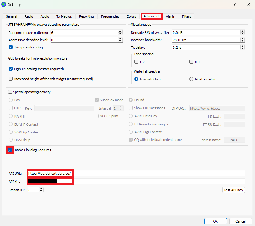 U.a. kann man hier direkt den API-Key für die Logbuch-Instanz in den Programmeinstellungen hinterlegen und WSJT-X speichert die QSO direkt im Logbuch. Keine weiteren Tools sind nötig.